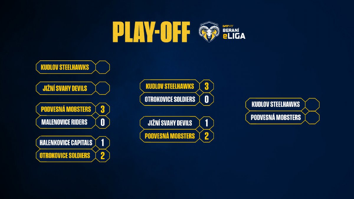 Vyřazovací boje nabídly hned několik dramatických sérií. Podvesná si ve čtvrtfinále poradila s Malenovicemi jasně 3:0 na zápasy. Otrokovice následně vyřadily Halenkovice 2:1 a v semifinále čekal Podvesnou těžký soupeř – Jižní Svahy Devils. Po napínavé sérii však Mobsters zvítězili 2:1 a vybojovali si postup do finále. Na druhé straně pavouka čekal, bohužel po kontumaci, vítěz základní části – Kudlov Steelhawks.