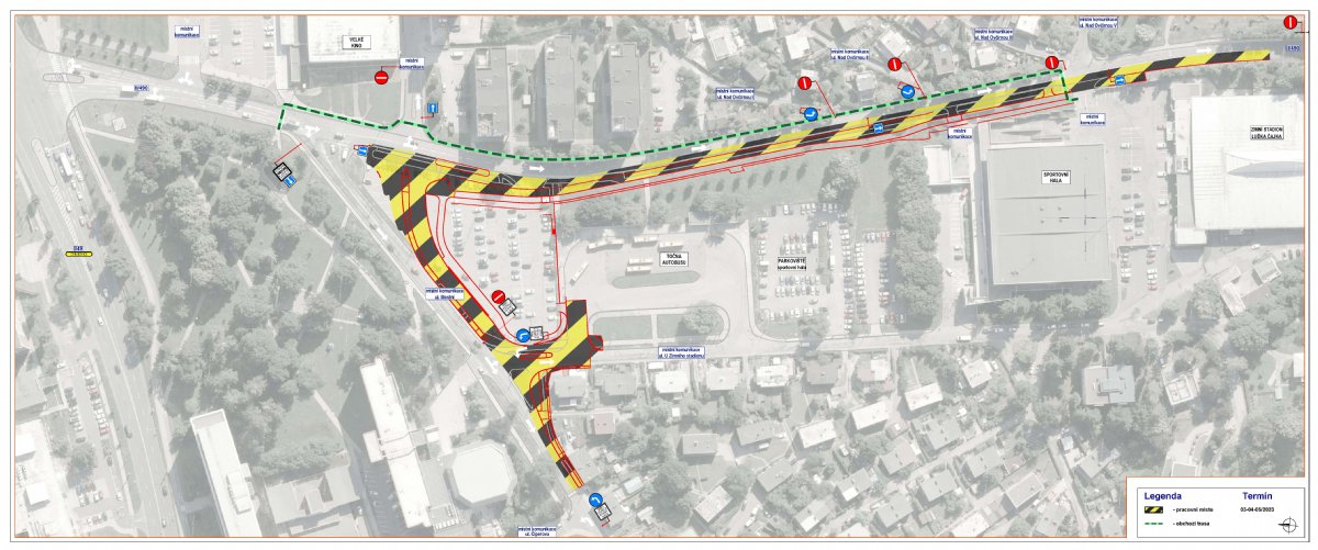 Na hlavní příjezdové ulici Březnická platí od pondělí 3. dubna jednosměrný provoz. To znamená, že doprava je možná jen ve směru z centra k okružní křižovatce K Majáku (Filmová). V opačném směru se jezdí po objízdné trase kolem Lesního hřbitova na Kudlov a dále do centra Zlína. Fanoušci se tak autem ve směru od Březnice přímo ke stadionu vůbec nedostanou.