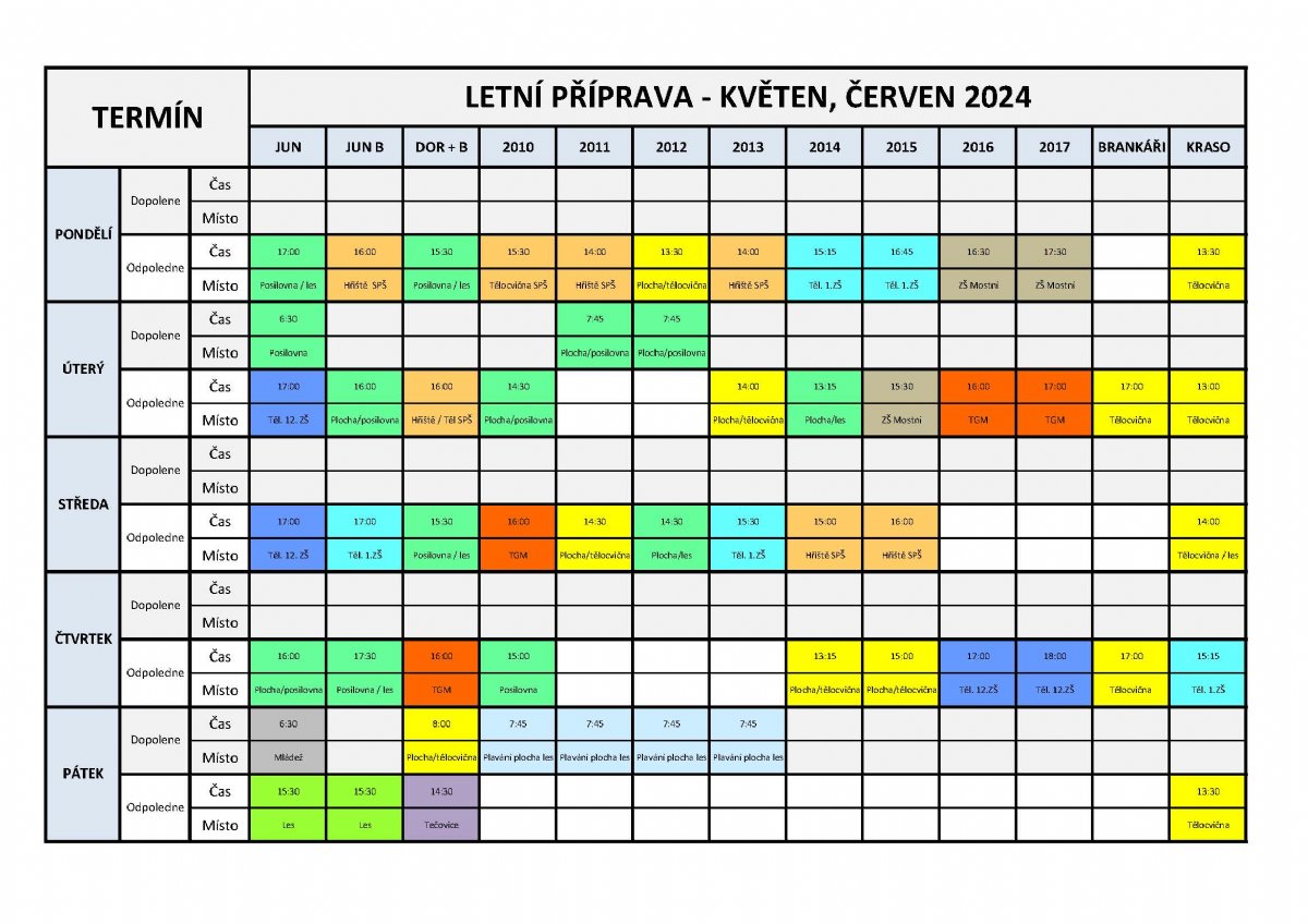 Po skončení soutěží v uplynulé sezóně a několikatýdenním volnu se vracíme opět do akce! Už brzy začíná všem mládežnickým kategoriím příprava na suchu, která letos bude probíhat od 6. května do 27. června. Níže se můžete podívat na podrobnou denní tabulku aktivit v rámci týdne, o detailech budou jednotlivé kategorie informovat jejich trenéři.